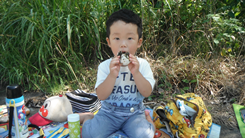 上空をヘリコプターが飛んで行くと「あれ、何?」「どこ、行くんだ」と話しながら大きなおにぎりをほおばるかなた君。大自然の中で秋の気配を感じながら食べるお弁当の味は格別です。あっという間に完食したはにいちゃんはみんなが食べている中、さっさと片付けて帰る準備を始めていました。