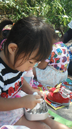 湧水を触っては「冷たい」「気持ち、いい」と喜ぶ子ども達ですが水溜りの中に入って遊ぶ子はいません。靴が濡れると後で歩きにくく,気持ち悪いことをしっているのでしょうね。いつもなら真っ先に水遊びを楽しむ子ども達なのに場所の違いが分かってきたのかなとここでも成長を感じました。園を出発して1時間15分、無事に水源地に到着すると「お弁当」「お弁当食べたいよ」シートを広げるやいなや弁当を取出し食べ始める子ども達。