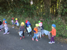 今回の散歩は秋探しをねらいに出発し、それぞれが発見を喜んだり、手に取ったり秋探しを楽しんでいました。発見した植物を今度はどんぐりごまや紙粘土工作など遊びに展開させていきたいと思います。四季を体で感じるとともに、その時期ならではの遊びを十分に行っていきたいです。