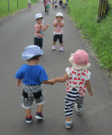 プールや泥遊びと暑い中での遊びを楽しんでいる中、先週は久しぶりに散歩へと出かけました。朝の会で「今日は2歳児さんと一緒に散歩に行こうと思います」という話を聞いていて会が終わると帽子を被っていく子、靴を取りに行く子と子どもたちなりに「散歩に行くためには・・・」と考えて行動へと移っていました。準備ができて、旧中学校方面へと散歩へ出発。
