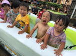 先週、プールを子どもたちと楽しみました。プールを始める前に子どもたちに水着か、泥んこパンツに着替えてからプールの準備を一緒にしようと伝えました。かもしか組さんがプールであそんでいるのを近くで見ていたので、子どもたちもさっと水着や泥んこパンツに着替えてプールの準備に来てくれました。シャワーから出る水を見ながら、プールに水が溜まっていく様子を楽しんで見ている子どもたち。