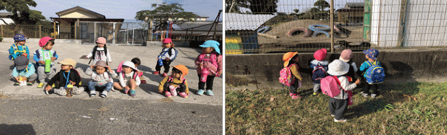 リュックを背負ってくる子どもたち、朝の身支度を済ませると「おべんと?」と言う姿がみられました。「おべんとう、まだだよ!お散歩行ってみない?」と言うと自分の靴を探して、帽子をかぶり、自分の帽子が無い子は園用の帽子をかぶっていました。