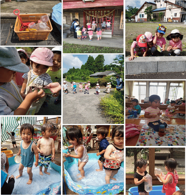 先週も天気がいい日に子どもたちと水遊びや泥遊びと楽しみました。たらいやビニールプールに水をためていき、早速はいる姿や中には入らずにペットボトルなどに水を入れて楽しむ姿などさまざま。遊びながら自分たちで使う道具を次々持って水が流れるところの泥をかき集めて、団子を作ったり、手や足に泥をつけて隠してみんなで「隠れてないよ」と互いに見つけ合ったりしていました。