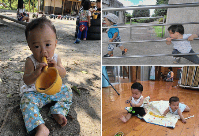 しんぺい君もともたか君に倣えとスロープ、階段で上り下りを楽しんでいます。歩くのが上手になり足の運びが様になって来ました。りゅうが君は這い這いで手すりの所に行き、つかまり立ちを披露してくれてニコニコです。木陰や涼しい所を見つけながら子ども達と散歩を楽しんで行きたいと思います。