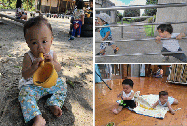 そうした活性が協調性、社会性にも繋がり、いつしか子ども達は自己肯定感を持っていけるのだと信じています。それぞれの年齢に合わせて子ども達の砂遊びは違います。らっこ組さんには砂の中で遊ぶ事で身体中の感覚がどんどん育っていきます。
