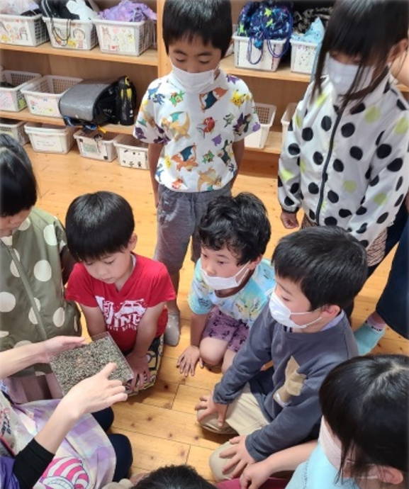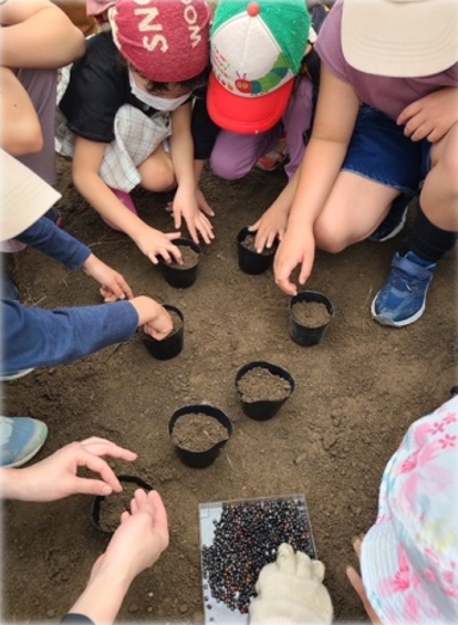 「おいしくな~れ♪」「優しく土をかぶせてっと」「たくさん実りますように」など声をかけながら、芽が出るのを楽しみにしています。夢中になる事や、その時期に出来ることなど、今後もいろんなことにチャレンジしていきたいと思います。