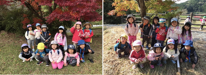 先日のお弁当の日は佳例川まで歩いて行きました。夏にも1度歩いて行った佳例川。今回は季節の変化を感じながら歩いて行きました。友だちと手を繋ぎ、前の人との間隔があかないようにと年少児さんも一生懸命歩いて行きます。起伏のある道をどんどん進んで行き、夏頃から比べると体力もついてきてしっかりとした足取りで歩いて行く子ども達に逞しさや成長を感じられた瞬間でもありました。長距離でしたが最後まで頑張って歩いていました。佳例川では夏に遊んだ川を見学し、色づいた紅葉を見たりしながら五感を通して季節の変化を感じている子どもたちでした。