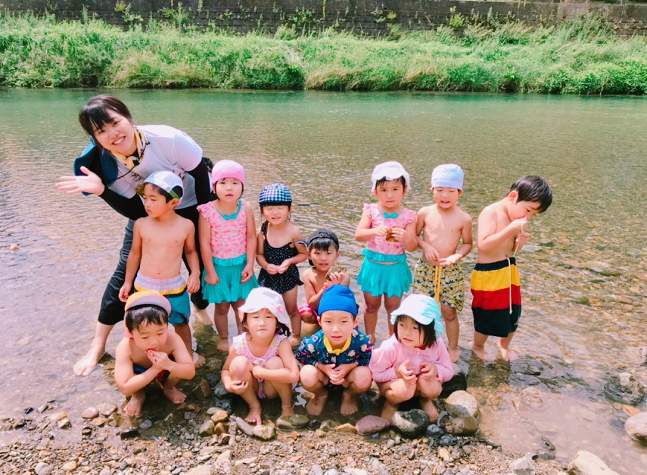 8月4日に大川原峡に川あそびに行きました。園で水着に着替え、水筒、フェイスタオル、洋服を準備し出発します。子どもたちは送迎車内で「どんな場所かな。」と笑顔で顔を見合わせていました。大川原峡に着くまでに橋やトンネルをいくつか通りました。「あ、この橋は2つ目だね!」「このトンネルはさっきのより長いね。」と、通り道で気づいたことを言い合う姿がありました。