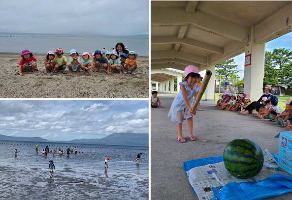 あすなさんは手についた海水を口に入れ「塩の味がする~」と自分の感じた事を率直に答えていたのが印象的でした。初日の最後は全員でスイカ割りを楽しみました。2日目は晴れたり曇ったりでしたが海水浴を楽しむことができました。今回は天候に悩まされた2日間でしたが子ども達はスイカ割りや海水浴を楽しんだりと、夏を存分に感じた2日間だったと思います。砂浜の感触、波の様子などプールでは味わえない貴重な体験ができました。顔を水につけるのが苦手なこともあると思いますが、この季節ならではの遊びで体をたくさん動かし、水に親しみを持ち活動したいと思います。