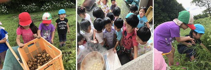 収穫したてのじゃがいもを昼から蒸して食べると本当に素朴な味ですが、自分の採ったという経験のすぐ後なのでフーフー言いながらかぶりついている子ども達の瞳はとても満足そうでした。自分達が種を蒔き、苗を植えて日々育てきた野菜を調理して食べるという事は、食品や食事への関心を高めることに繋がっていきます。自分達が食べているものが、どこで、どの様にして育ち、収穫され、どの様に調理されて自分達の口に入るのか、畑で朝摘みしたものをそのまま食するのも良い経験だと思いますが、調理をすることで、食べる意欲が増すという事もあります。