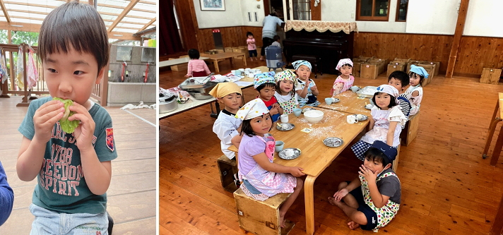 二回目の塩漬けをする際には、年少児さんと年中児さんに塩漬けの道具の準備を一緒に行ったり、梅のへたの取り方を伝えたり、洗ったあとに「これ(キッチンペーパー)で拭くんだよ。」と活動を教えてくれていた年長児さんの姿がありました。様々な活動のなかで、年長児さんが憧れの存在となるように、“伝える”ことを重ねていくことができるような活動を保障していきたいと思います。