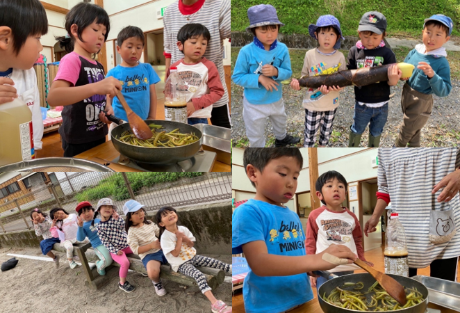 この1ヶ月で桜餅、あくまき、つわ採り、筍採りと季節を感じながらクッキングに挑戦しました。友だちともち米の洗い方を教え合ったり、もち米や筍、つわがどんな変化をするか実験を楽しんだクッキングでした。また、クッキングの準備をしている時に、エプロン、三角巾を3歳児さんが苦戦していると、自然と力を貸してくれる姿が見られたりと素敵な出来事も見られました。