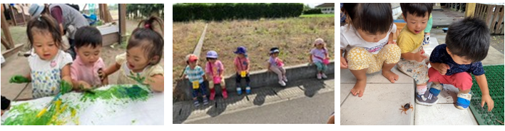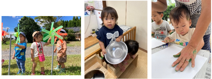毎日よく食べ、よく動き、遊びを楽しんでいます。お散歩バッグを手に持ち、「ぽ(さんぽ)行く」「さんぽ、行きたい」と子ども達からの要望に応えて散歩に出掛けます。目を輝かせてバッタやカマキリを追い掛けたり、どんぐりや落ち葉を大事そうに拾い、お散歩バッグに入れてお土産に持ち帰ったり、子ども達は夢中になって探索を楽しんでいます。子ども達にとってはどんぐりや落ち葉、虫も大切な宝物です。秋ならではの自然や味覚を肌で体験し、植物の成長の不思議さと自然の恵みへの感謝の気持ちを小さい時から育めるように一緒に感じていきたいと思います。