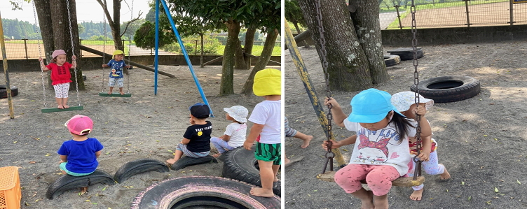 あとから子どもたちがどんどん集ってきてブランコも全部出して遊びだしました。自分の番が来るまで友だちを押してあげる姿、順番が来るまで待っている姿、まだまだ乗っていたい姿と遊んでいく中で色々な子どもたちの姿がありました。私たちが仲介していくこともありますが、子どもたち同士でのやりとりが増えていき一緒に仲間としての思いも培っていけるように努めたい、ひとり一人の思いをしっかりと聞いて言葉にしてより、繋がりや関わりに広がりがでていけるようにと思います。