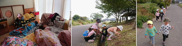 先週は散歩に行き、もみじの葉が落ちているのを見つけて自分たちの手と合わせて「(葉が)小さいね」と比べ、焼き芋で使う杉の葉をダンプで押しながら拾いに行き「焼き芋しようね」と楽しみに話が弾んでいた子どもたち。探索、季節を感じながら散歩をしていきたいと思います。