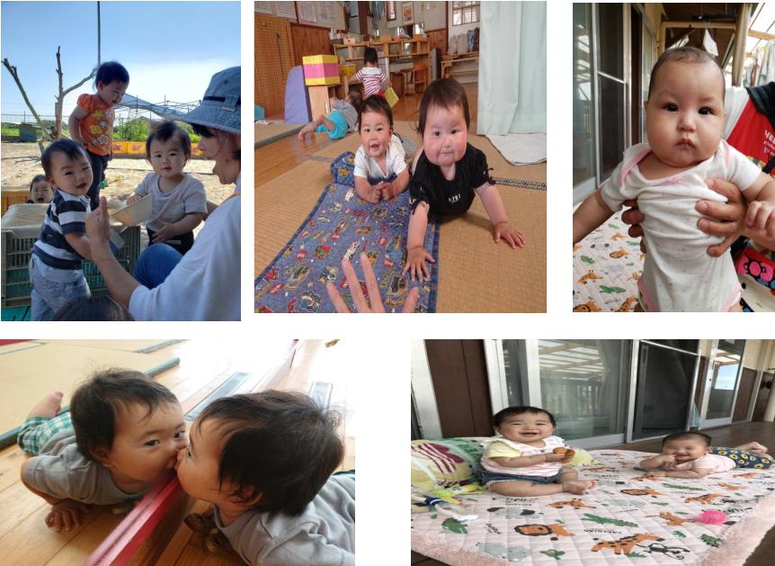 ※6月も終わりですが、らっこの子ども達も日々成長しています。友だちに興味を示し、手を出しながらお互いの顔を触って確認し合っていますよ! アデノウイルス感染症による発熱が発症しました。引き続き検温・視診を丁寧に行いますね。子ども達の様子で、いつもと違うことがありましたらどんな些細なことでも構いませんので教えてくださいませ。