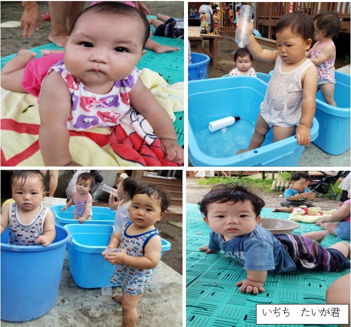 さて、らっこ組の只今のブームは水遊びです。タライに水を溜めて気持ち良さそうに水遊びを楽しんでいます。ペットボトル、プリン容器、ボールを使って入れたり、流したりしてそれぞれに楽しそうです。夏ならではの水遊びを身体で感じて暑い夏を気持ちよく過ごし易くしていきたいと思います。着替えが多くてご家庭での洗濯が多く申し訳なく思いますがこれからもご協力よろしくお願い致します