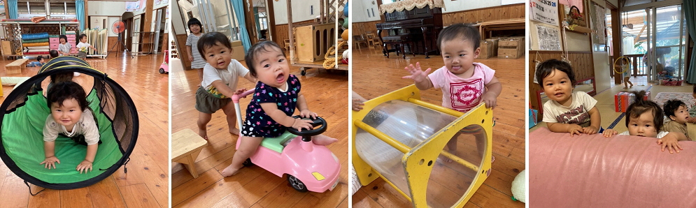 月齢の小さな友達を気掛けたり、一緒に遊ぶ姿もたくさん見られ、お互いの顔を見合わせて笑い合ったりして楽しさが私達大人にも伝わって来ます。そんな子ども達の様子を大事にゆっくり、じっくり保育していきたいと思います。運動会、楽しみにしていて下さいね。