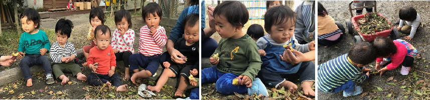 11月も下旬になり、季節の上では冬がそこまで来ています。日中はぽかぽか暖かいお日様の光で園庭を駆け回ったり、散歩を楽しむ子ども達の姿が見られます。園庭の銀杏の葉っぱや木々の葉っぱを拾いながら「♪あーかいあかい もみじのは♪」ともみじの歌を口ずさむ子ども達。落ち葉拾いも子ども達は楽しみながらしています。