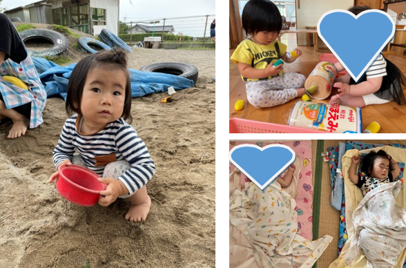 先週から、ようやくセンダンの花も散り、虫の発生も治まりました。裸足のまま、ニコニコ顔で階段を下り園庭へ遊びに行くかいとくんの表情に、ホッと一安心して過ごしている毎日です。あとからHちゃんも追いかけて外に保育教諭と出て行きます。座位が安定し、砂場で座って皿や砂を掴んで感触を味わっています。時にはダイナミックにうつ伏せで砂山にずり這いしていく逞しさも見せてくれました。